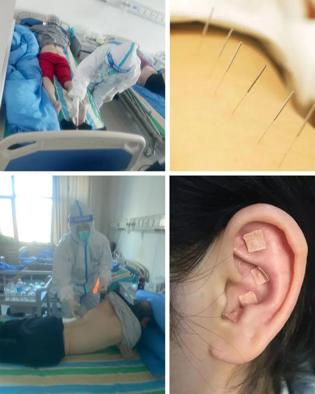科研16楼病区的医疗负责人陈俊逾主任带领医疗团队对感染患者指导使用多种中医中药治疗方式。针对出现发热乏力、周身酸痛、咳嗽咯痰、胸闷憋气腹泻或大便粘腻不爽的寒湿郁肺型新冠患者,给予针灸、拔火罐、耳穴压豆、放血疗法以逐寒祛湿、清瘟通络。针对出现低热或不发热、干咳痰少、咽痛口干的湿热蕴肺型新冠患者,给予针灸、膀胱经走罐,以清热化湿、清瘟通络。针对患者出现的焦虑抑郁情绪给予床旁心理支持;大便不畅的患者给予中药保留灌肠。