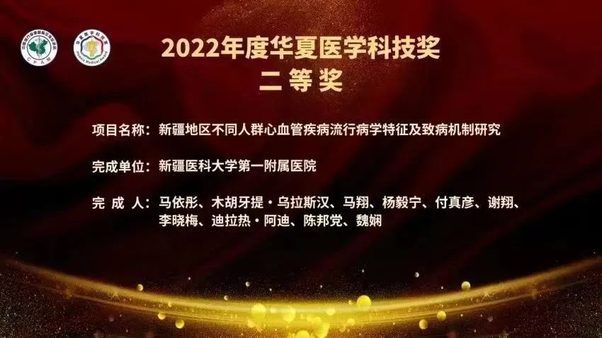 12月15日,2022年度华夏医学科技奖颁奖大会在北京召开。beat365中文官方网站马依彤教授团队申报的《新疆地区不同人群心血管疾病流行病学特征及致病机制研究》荣获“华夏医学科技奖”二等奖。