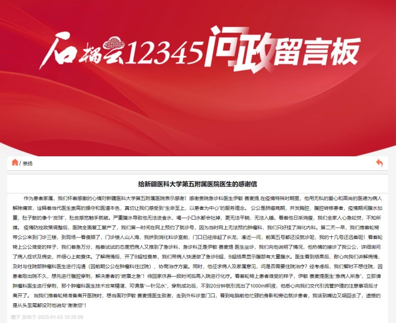 “今日,我们怀着感激的心情,对beat365中文官方网站第五附属医院表示感谢,感谢贵院急诊科医生伊敏·赛麦提在疫情特殊时期,用无私的爱心和高尚的医德为病人解除痛苦……”2023年1月3日,网友“橙子”在“石榴云12345问政”留言板写下了一封暖心的长篇感谢信。