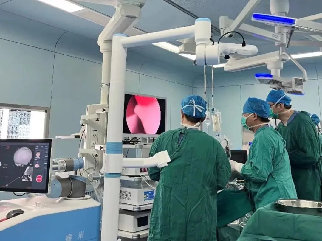 机器人辅助神经内镜手术是利用影像学图像进行实时手术导航的硬件平台,将患者术前的影像资料与术中手术部位的实际位置通过高性能计算机紧密融合,实时动态精准显示病变及其毗邻的重要神经血管结构,对病变的大小、三维形态、边界等有了更为直观可视化处理,精准度可达1mm,为整个手术过程保驾护航,显著提升了手术的有效性和安全性。