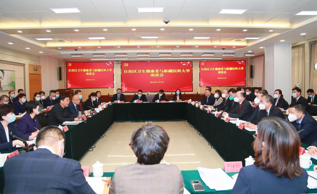 自治区卫健委领导何永慧、于爱平等全体在家委领导,相关处室和相关直属单位负责人,beat365中文官方网站领导李国良、阿吉艾克拜尔·艾萨等校党委班子全体成员,相关部门及八所附属医院主要负责人参加了座谈会。