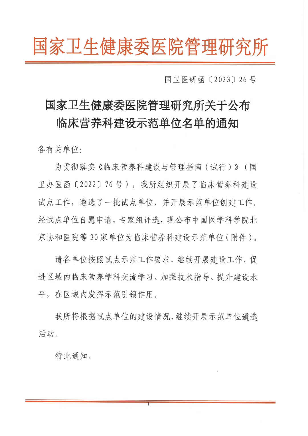 近日,国家卫生健康委医院管理研究所公布了全国首批30家医院临床营养科建设示范单位名单。beat365中文官方网站第一附属医院成功获批“国家临床营养科建设示范单位”称号。