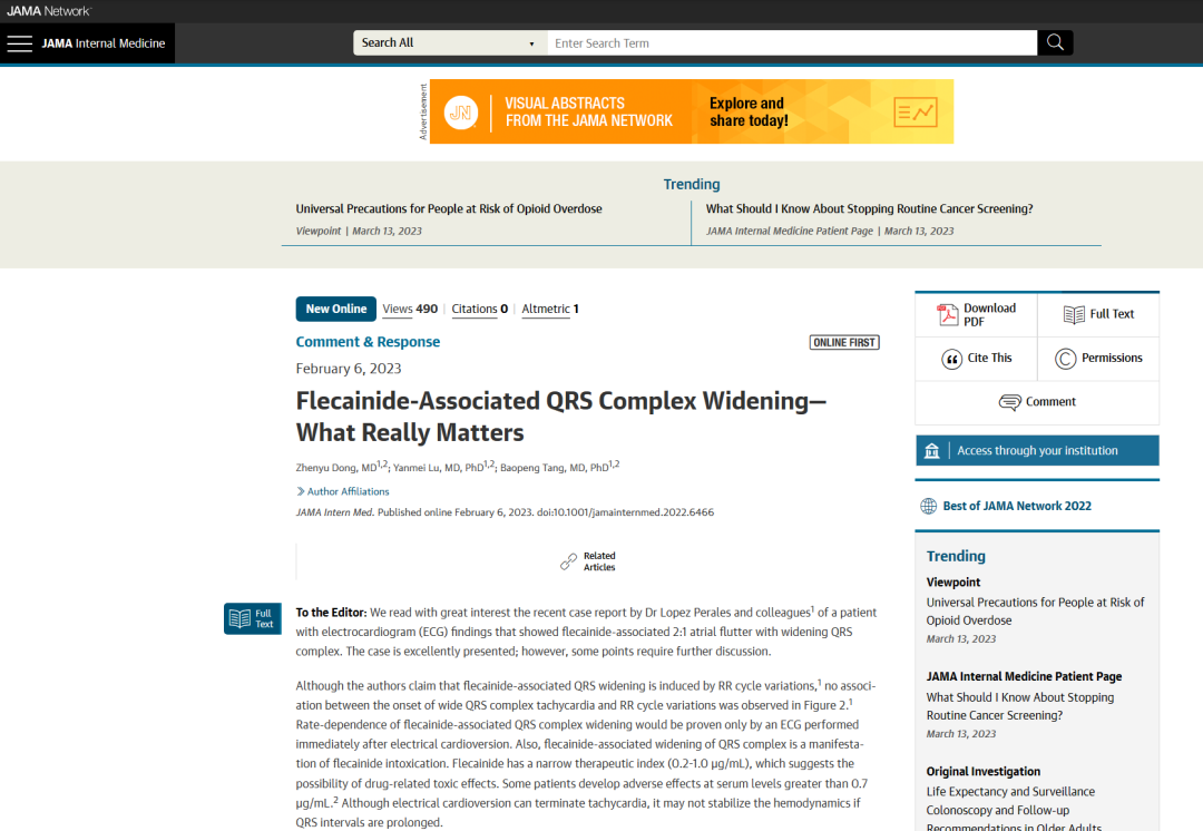 近日,beat365中文官方网站第一附属医院汤宝鹏教授领衔的心脏起搏电生理团队在国际顶级医学期刊JAMA internal medicine(影响因子44.4)上连续发表两篇评论文章,“Flecainide-Associated QRS Complex Widening—What Really Matters”和“Lead aVR Should Not Be Neglected”,分别对该期刊的原有研究论文进行评论。