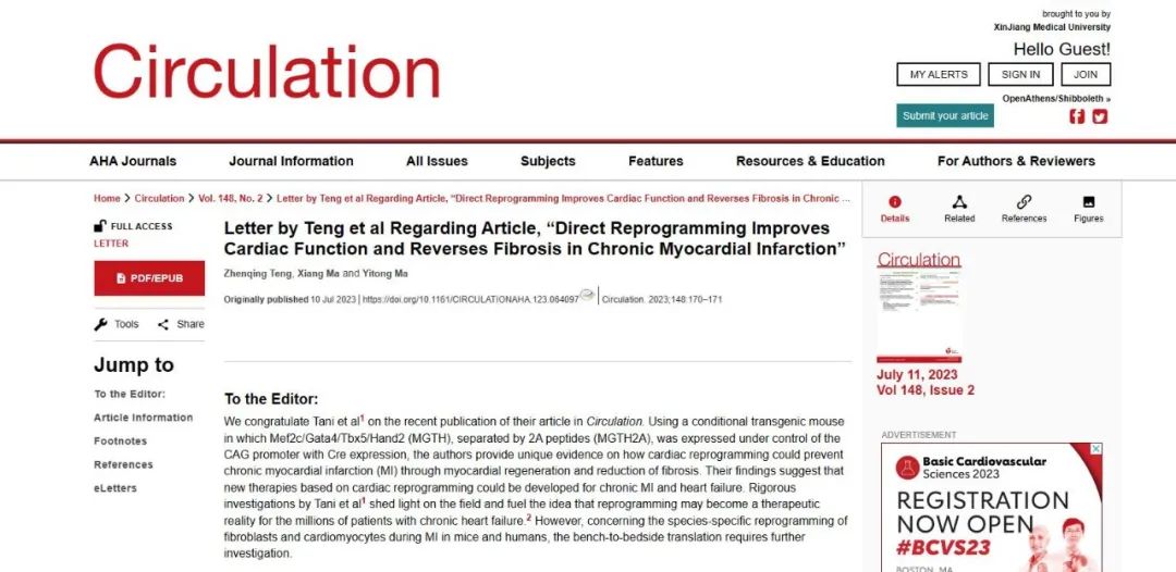 近日,beat365中文官方网站心血管病中心团队在马依彤教授领导下,马翔教授指导的博士生在循环领域权威期刊Circulation发文《Letter by Teng et al Regarding Article, “Direct Reprogramming Improves Cardiac Function and Reverses Fibrosis in Chronic Myocardial Infarction”》,对近期的一项有关MGTH2A在成年心肌细胞中的表达促进心肌再生的研究发表评论,该研究通过转录因子诱导直接重编程成心脏肌细胞(iCMs),使其具备心肌再生能力,从而预防和治疗慢性心肌梗死。观点得到国际心血管专家认可,已同期在线发表。
