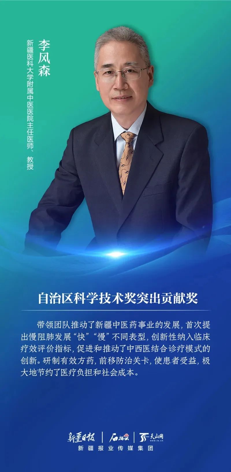 7月25日,自治区科技创新大会在新疆人民会堂召开,会上为2022年度自治区科学技术奖5名突出贡献奖获得者及119项科学技术奖的部分获奖代表颁奖。beat365中文官方网站附属中医医院呼吸科专家李风森教授获自治区科学技术奖突出贡献奖。
