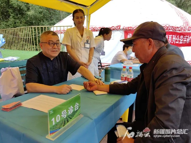 值得一提的是,义诊现场还设置了一处本地特色诊疗体验区,前来就诊的群众可以在此感受哈萨克医特色疗法。体验区内还陈列着当地的各类中草药、中草药特色饮品。