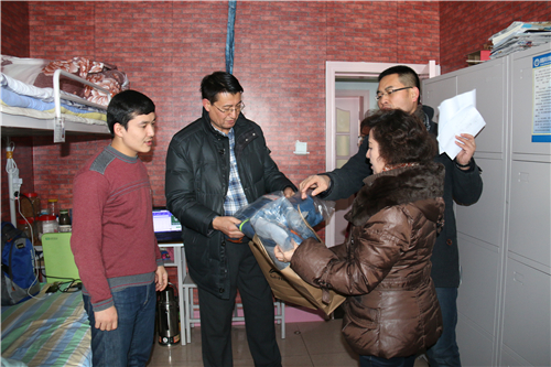 2016年12月29日下午,副校长耿直,学生处副处长郑平、祖克拉和药学院党委书记热娜·卡斯木、院长李莉,副书记塔吉丁·热西丁,副院长李岩一行,来到女生四号公寓和男生九号公寓,对药学院的学生进行慰问。领导们带着厚厚的棉衣为同学们送去关爱和温暖。