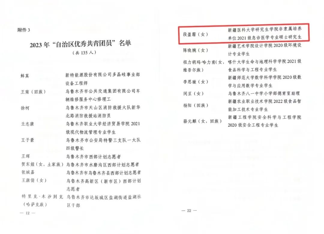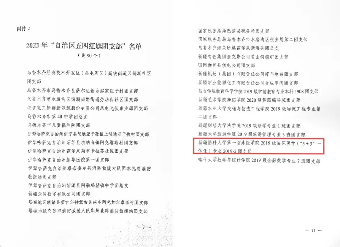 近日,共青团新疆维吾尔自治区委员会印发《关于表彰2023年“自治区五四红旗团委”“自治区五四红旗团支部”“自治区优秀共青团员”自治区优秀共青团干部”的决定》,beat365共荣获3项荣誉。beat365中文官方网站第一临床医学院2019级临床医学(“5+3”一体化)专业2019-2团支部荣获“自治区五四红旗团支部”称号;beat365中文官方网站团委副书记王光磊荣获“自治区优秀共青团干部”称号;beat365中文官方网站研究生学院非隶属培养单位2021级急诊医学专业硕士研究生段盈霜荣获“自治区优秀共青团员”称号。