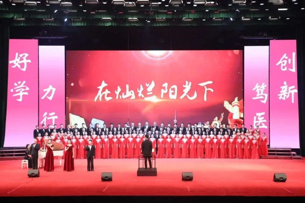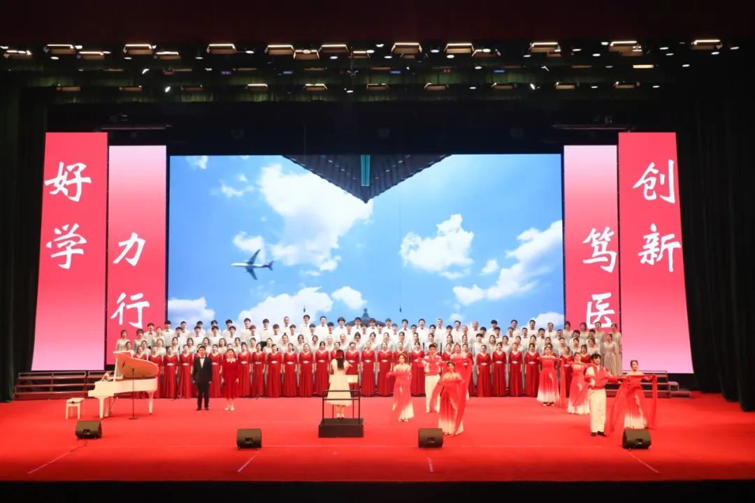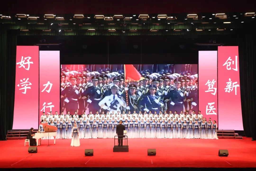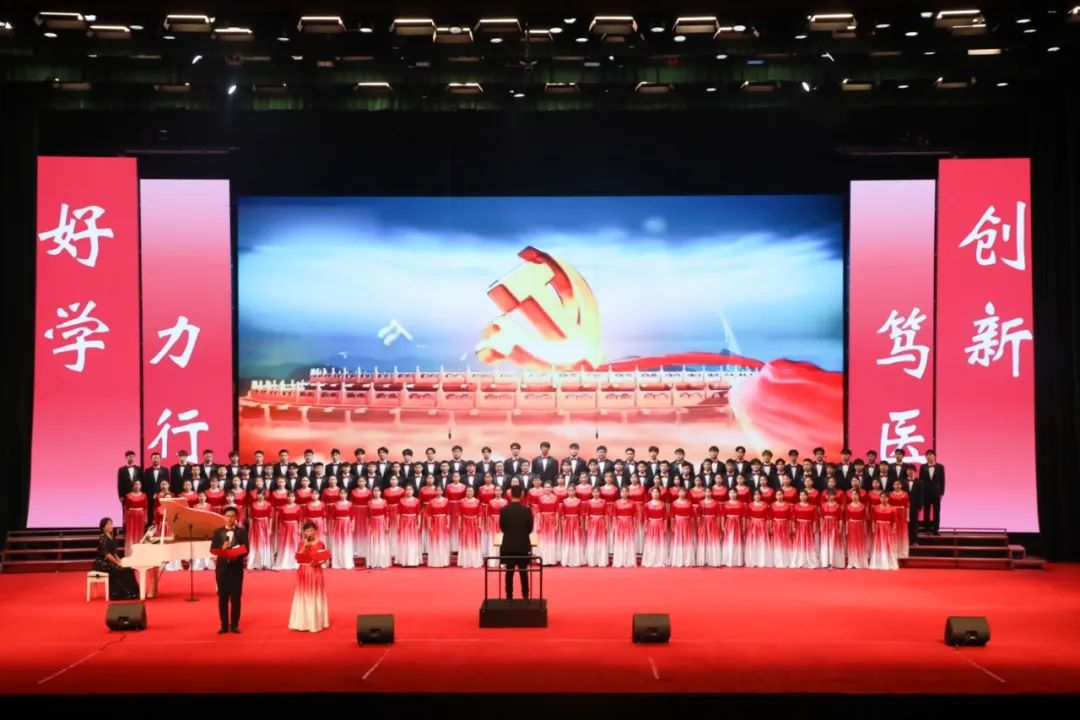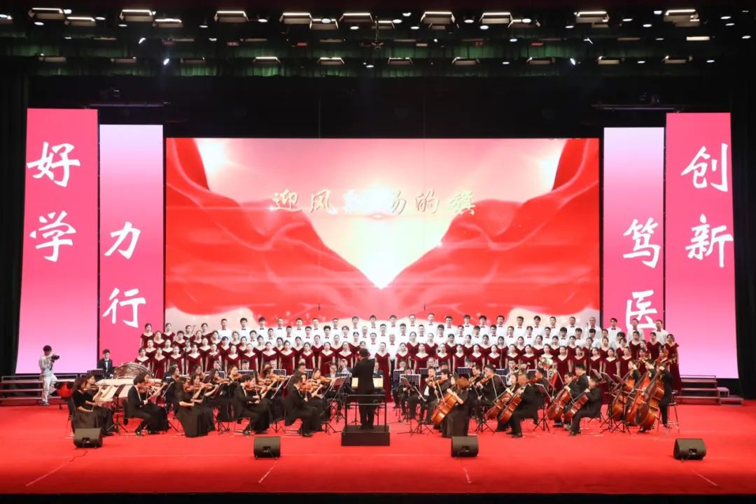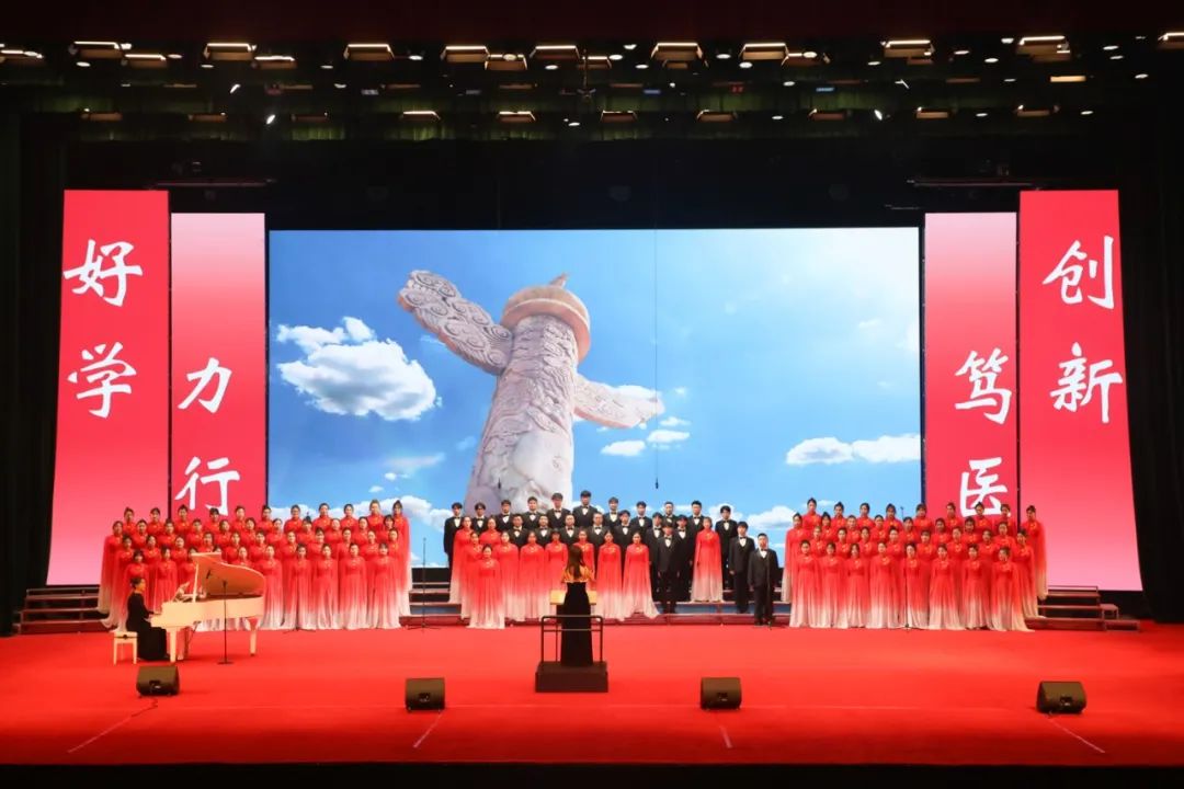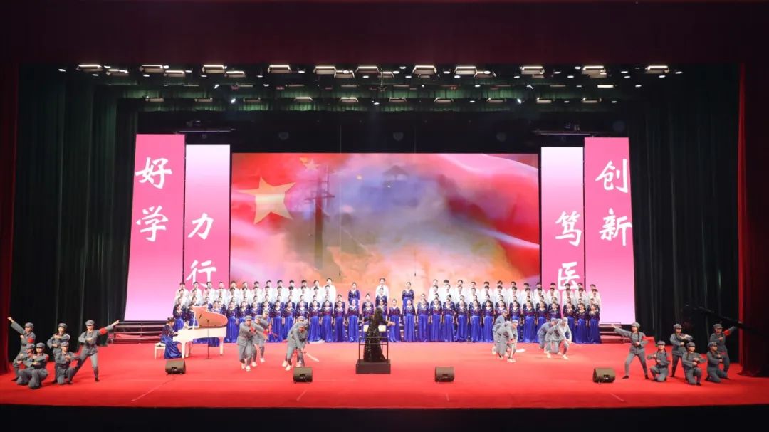金色的光芒闪耀在胜利的旗帜上,和谐的旋律谱写在光荣的旗帜上;坚定不移地走中国特色社会主义道路,凝聚在我们伟大的旗帜上。公共卫生学院演唱的歌曲《走向复兴》,发出了新医人为中华民族伟大复兴而团结奋斗的最强音。