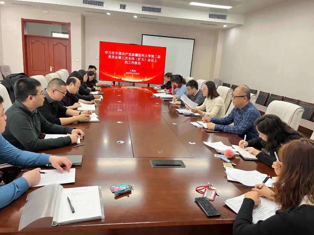医学工程技术学院党委组织全体教职员工,集中学习校党委二届三次全会精神,研究部署学院的重点任务,号召全体教职员工以更加饱满的热情、更加负责的态度、更加细致的工作,推动各项工作落实落细落到位。医学工程技术学院党委委员、副院长努尔尼沙·阿力甫说,作为新一届党委委员和一线科技管理工作者,我将立足学校高质量发展对科技创新的新要求,围绕国家和自治区卫生健康领域问题,以明确的目标和精准化科研发展规划,增强管理和业务工作的“质、效、精”,积极与有国际影响力的高校和研究机构建立新的合作关系,开辟“医工交叉”深度融合的新赛道、凝练科学问题和重点研究方向,优化学科和团队结构,以学校‘四大工程’为引领,实施科技创新。