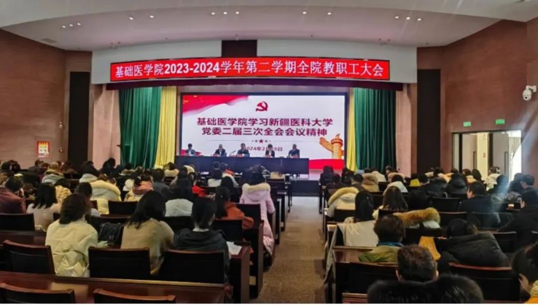 基础医学院举行2023-2024学年第二学期全院教职工大会,传达学习了校党委二届三次全会精神,激发广大教职工干事创业的积极性。基础医学院党委书记、副院长何斌说,学校发展蓝图已描绘、目标已明确,作为基层工作者,唯有坚决贯彻执行,把工作“做实、做细、做扎实”,打通“最后一米”,竭尽全力做到“精准、精细、精确、精致、精美”。我们要坚决守好育人主阵地,始终坚持“学术研究无禁区,三尺讲台有纪律”的原则。抢抓机遇、攻坚克难,把“为党育人、为国育才”的爱国情、报国志落实到行动上,体现到工作中,紧紧围绕立德树人根本任务,持续推动高质量发展,不断深化综合改革,昂首阔步朝着建设教学研究型高水平学院目标努力奋斗!