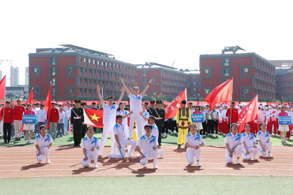 由60名学生代表组成的红旗方阵如似火的年华如胜利的凯歌象征着新时代青年昂扬奋进的精神面貌走出新时代新医人的青春与活力