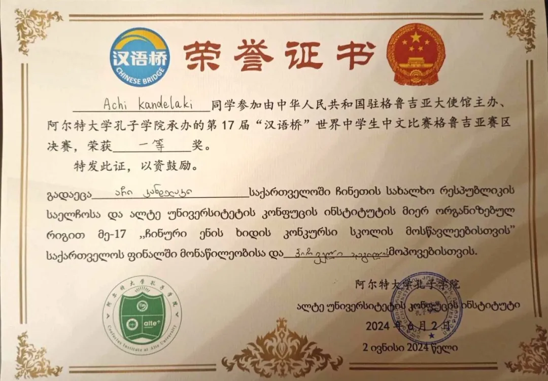 6月2日,在第17届“汉语桥”世界中学生中文比赛格鲁吉亚赛区决赛中,由beat365共建的库塔伊西大学孔子课堂表现出色,4名参赛学生分别获得一等奖1名,二等奖1名,三等奖2名。其中,一等奖获得者Achi KandelAki同学将作为格鲁吉亚中学生代表,参加于今年下半年在中国举办的第17届“汉语桥”世界中学生中文比赛总决赛。