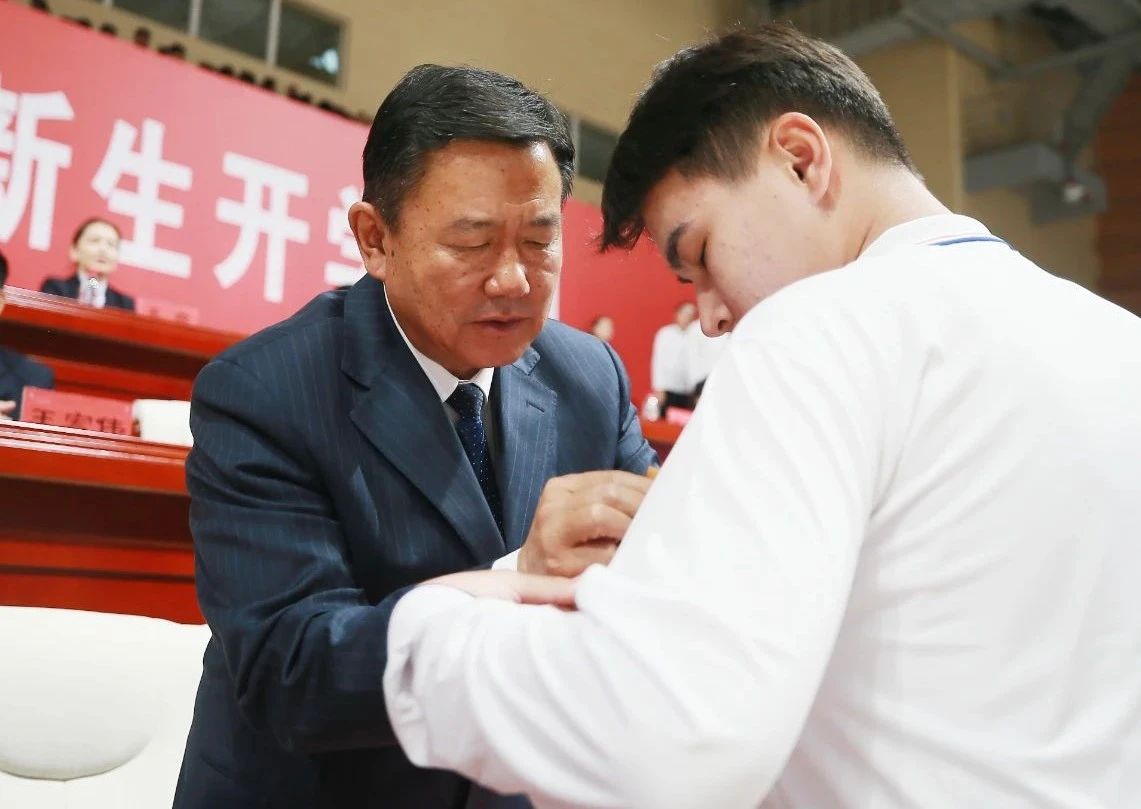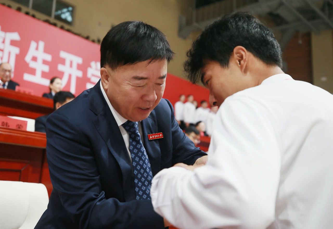 校领导为新生代表佩戴校徽。全体新生也一同起立,佩戴上了象征着光荣与自豪的“新医人”标识。2024级新同学与新医一辈子的结缘从今天正式开启,同学们将在新医开启一段逐梦的新征程。