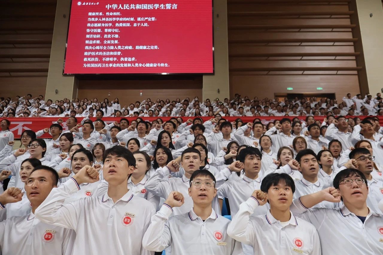 在副校长刘涛的领誓下,全体同学起立宣誓《中华人民共和国医学生誓言》,励志献身祖国的医学事业,为“健康中国”作出自己的贡献。