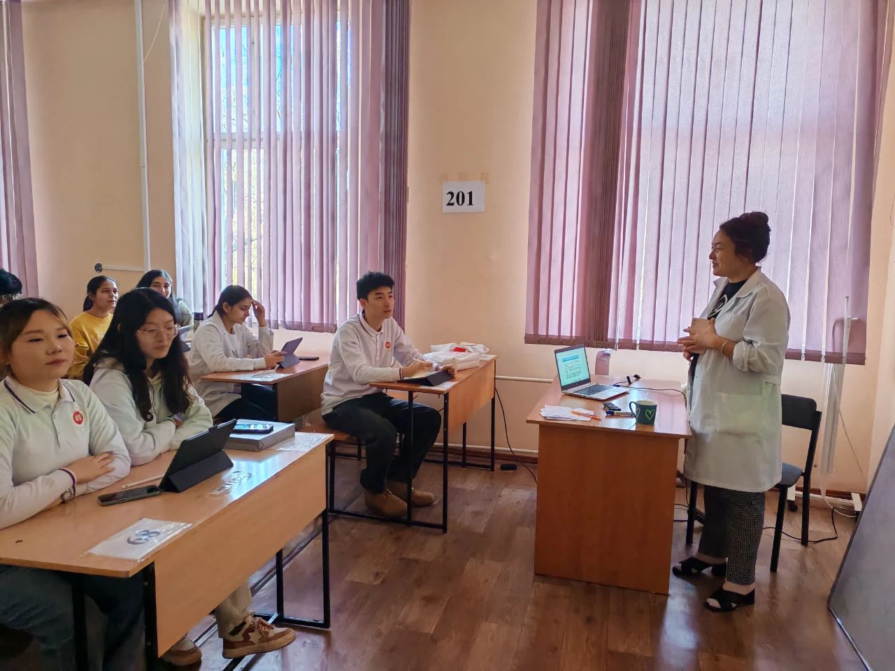 新医学子与阿里-法拉比国立大学医学系的同学们同上一堂药理学课