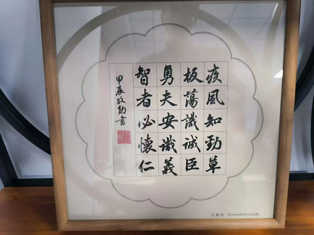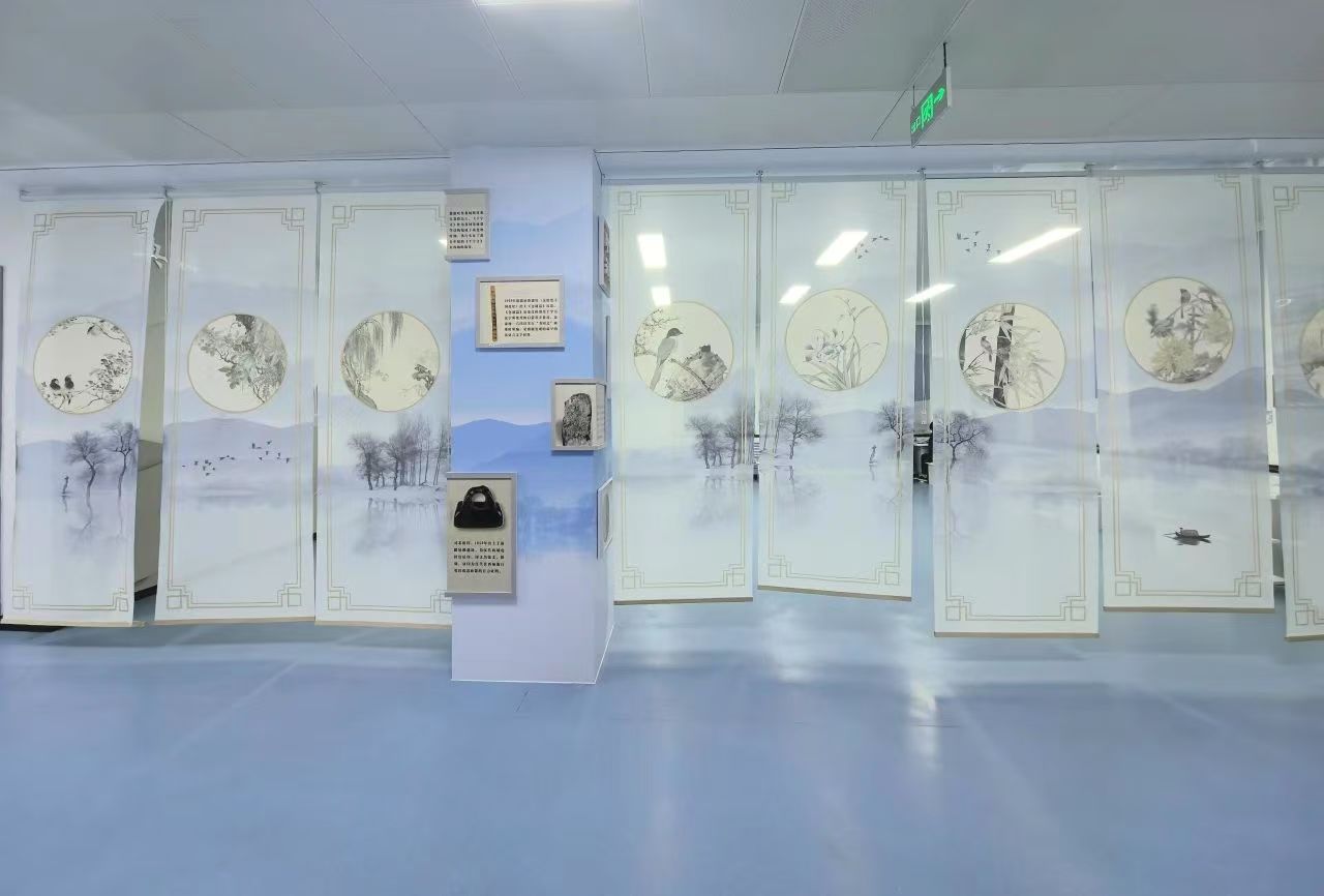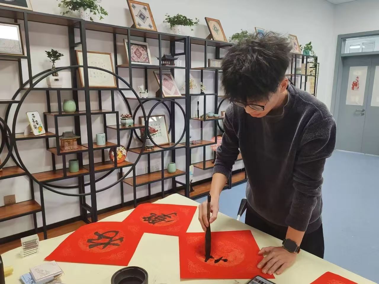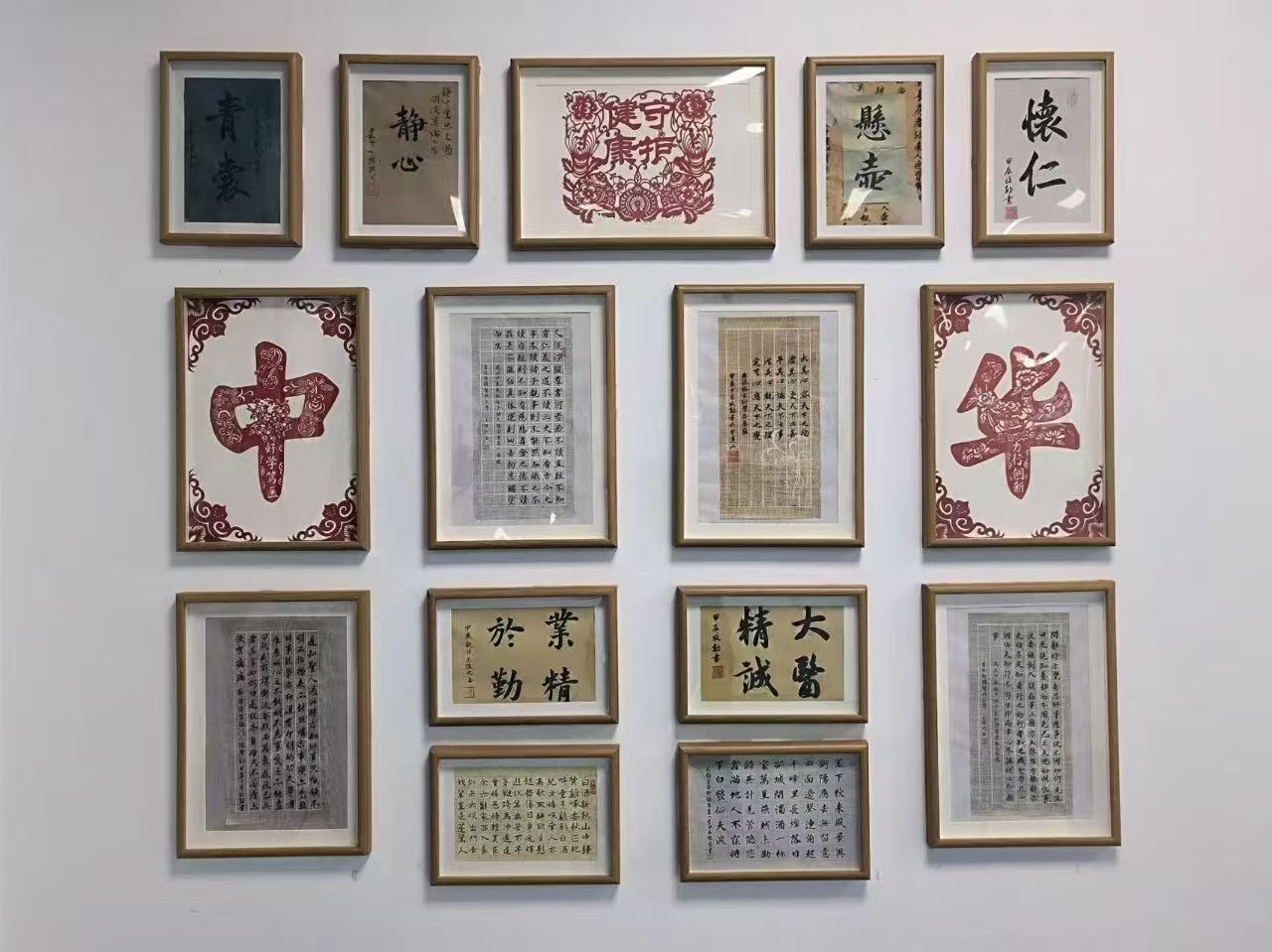 走进教室,目光便被博古架上琳琅满目的展品所吸引。这其中绝大多作品来自学生原创,精美的掐丝珐琅、典雅的漆扇、飘逸的书法作品、独特的鸟冠、剪纸艺术作品……这里不仅是中华文化传承地,更是语言艺术的殿堂,为广大校师生带来优质的文化体验和艺术享受。