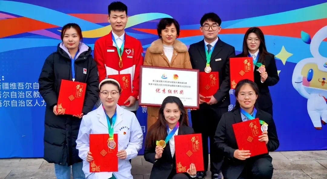 本次大赛自2024年10月启动以来, 学生处、团委、研究生学院精心组织,各学院广泛动员,全校2300余名学子报名参赛。通过“赛前经验分享-学院初赛-校级决赛-省赛集训-模拟路演”五级培养体系,历经3个月的系统打磨,最终选拔出7名优秀选手与全疆49所高校、14个地(州、市)西部计划及“三支一扶”选手同台竞技。新医学子凭借扎实的专业素养、出色的职业规划能力和稳定的现场发挥,在236名参赛者中脱颖而出,充分彰显了“厚植家国情怀、服务健康新疆”的职业担当。