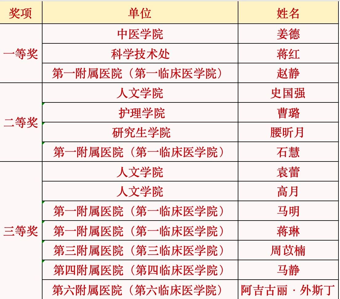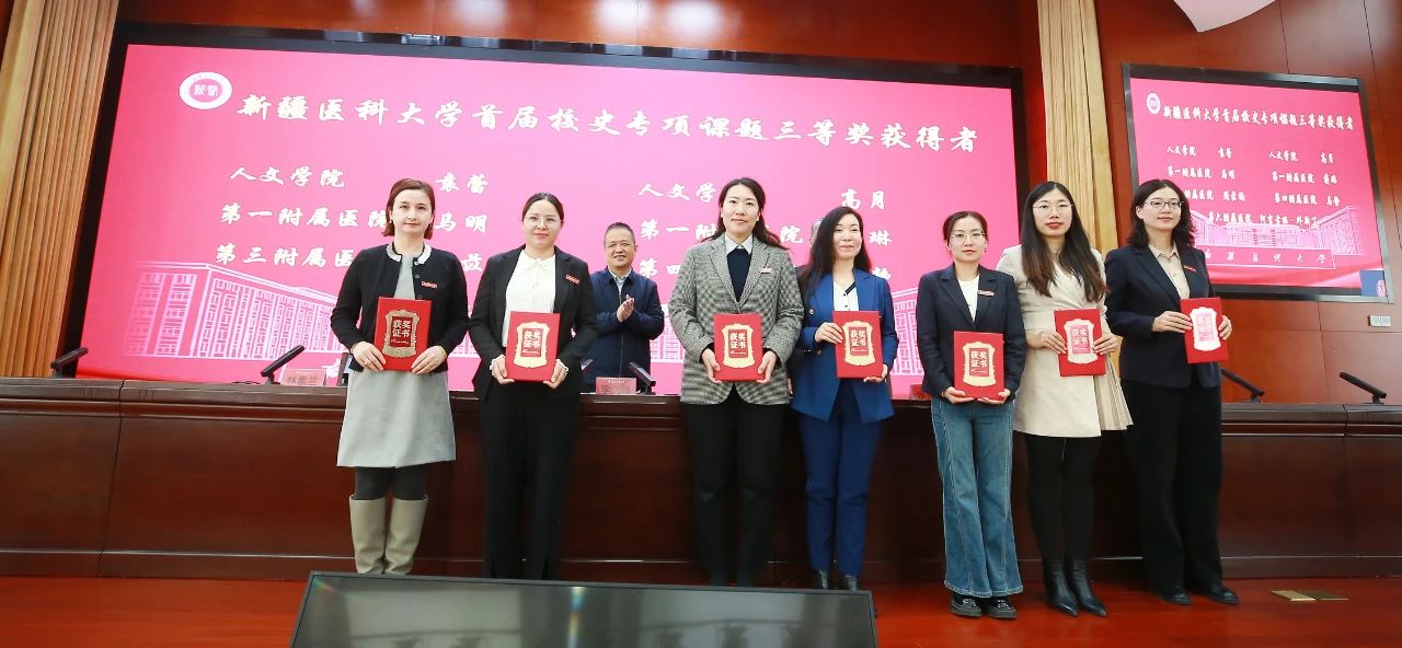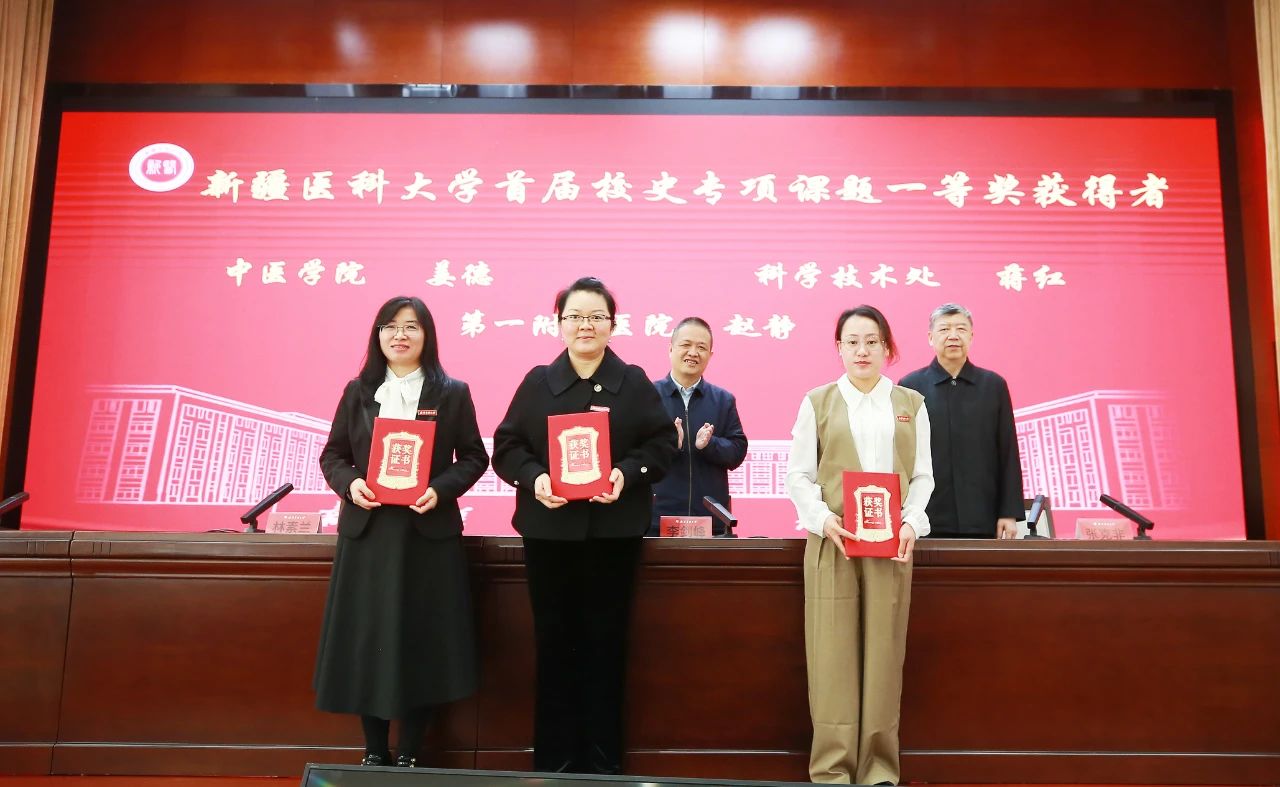 校史专项课题研究成果获奖者代表,第一附属医院(第一临床医学院)赵静、中医学院姜德团队的孙元鹤、科学技术处的蒋红分别作了《以beat365中文官方网站第一附属医院发展各阶段的不同领域具有突出代表性人物的史料挖掘和整理》《“西北燥证”研究脉络传承》《beat365中文官方网站在新疆重大疾病、特高发病防治方面研究的相关校史史料挖掘》的交流汇报。