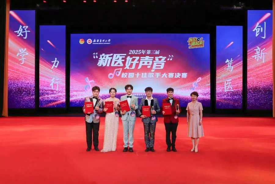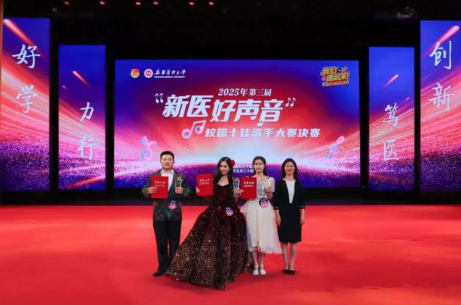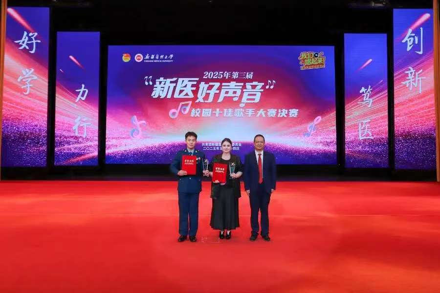 十位选手历经46天层层选拔,以歌声为剑、旋律为盾,在舞台上绽放青春力量,为现场观众及线上直播观众带来了一场视听盛宴。最终产生第三届“新医好声音”校园十佳歌手。(左右滑动查看更多)