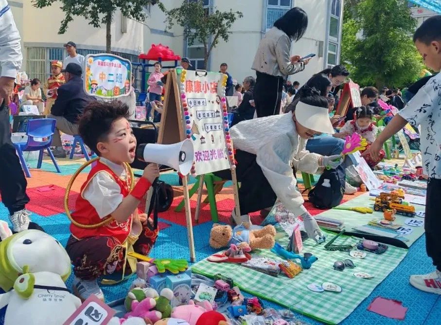 中大班亲子跳蚤市场热闹开市,“小掌柜”们精心布置摊位,图书、玩具琳琅满目。孩子们在吆喝叫卖中体验货币交易,在商品交换间领悟资源循环,爸爸妈妈们也帮助引导孩子制定价格、计算收支,让环保理念与财商智慧在欢声笑语中悄然萌芽。