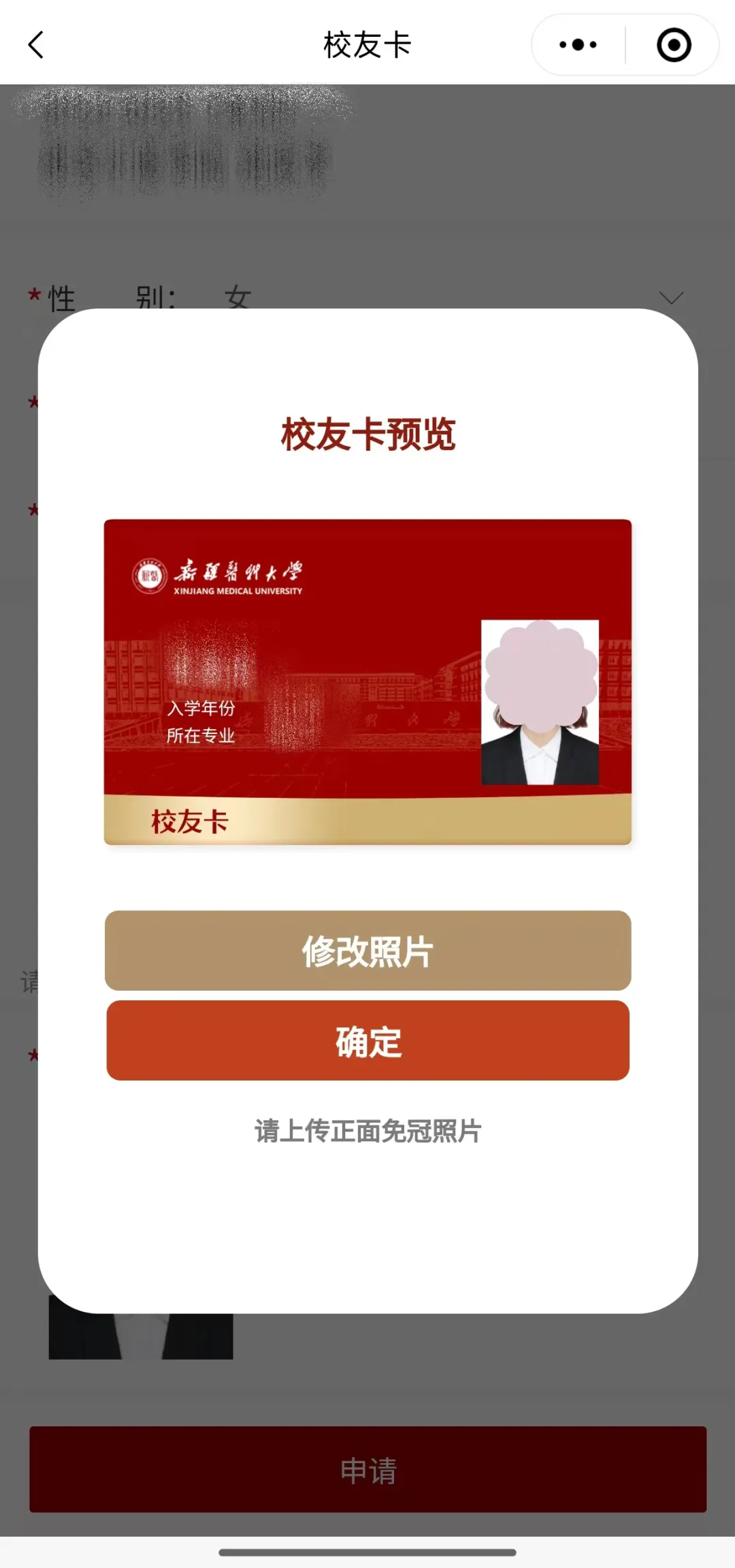 为加快审核速度,申领校友卡时请务必上传本人正面、无遮挡高清免冠头像,如未通过审核,需重新上传后再次提交申请。