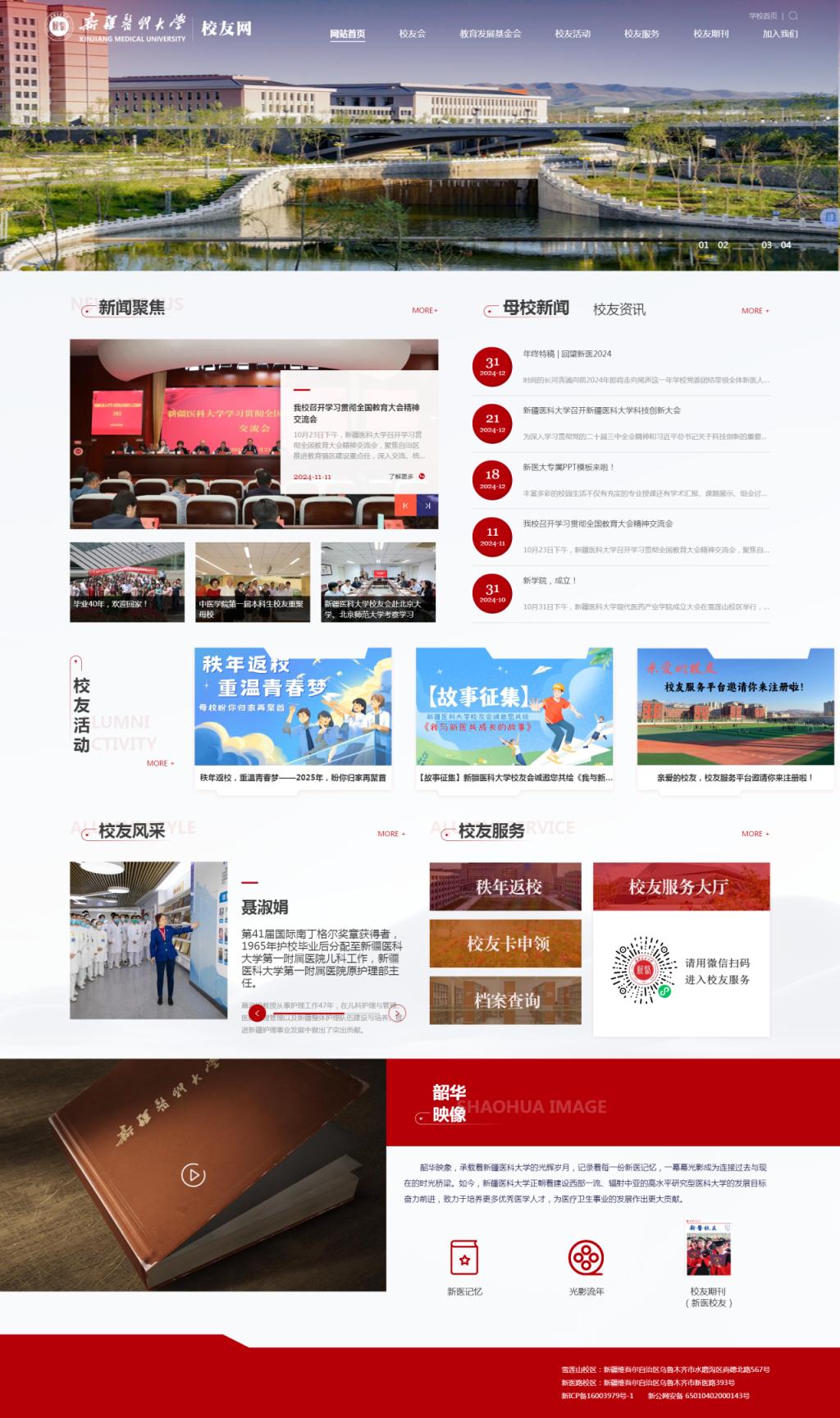 发布学校宣传片、新医记忆等主题文章、主题相册、新医校友电子期刊等,记录每一份新医记忆。