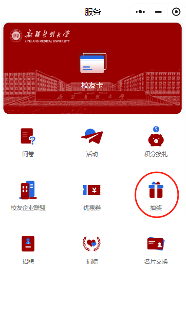 1.通过新医校友小程序-服务-抽奖功能进行抽奖,参与活动的校友须通过微信进入“新医校友小程序”,注册后参与抽奖活动,抽奖次数:每人限抽奖1次;