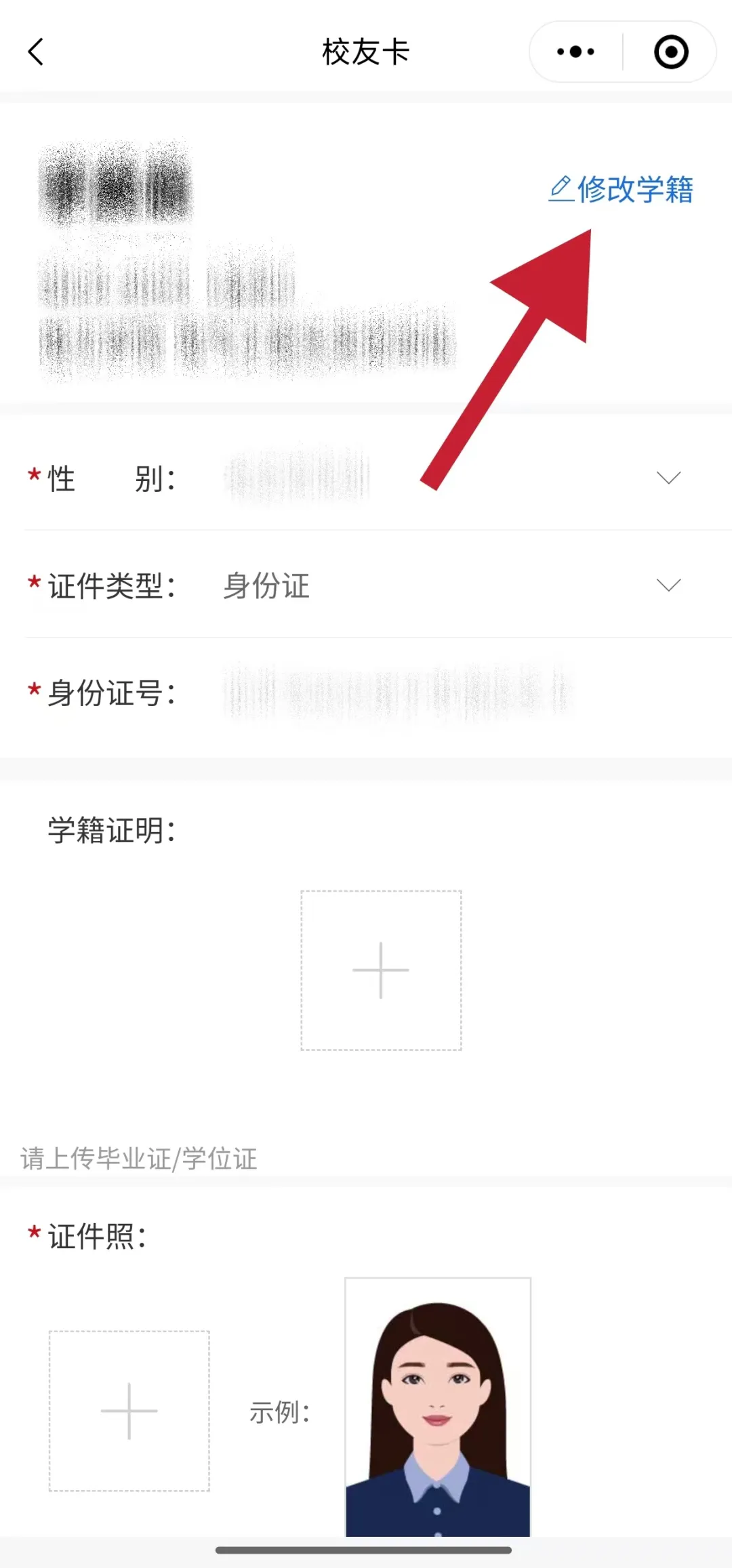 若您有多段在校经历,可点击右上角的【修改学籍】,选择您想在校友卡中展现的学历信息;若修改学籍中所展示的学历信息不全,可前往【我的】—【个人信息】—【添加学历】进行补充。