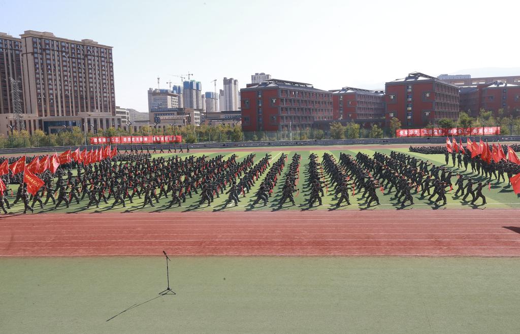 在军训总结表彰大会上,同学们的军体拳表演动作刚劲、气势如虹,反应敏捷、出拳凌厉,展现出良好的军事素养和精神风貌。