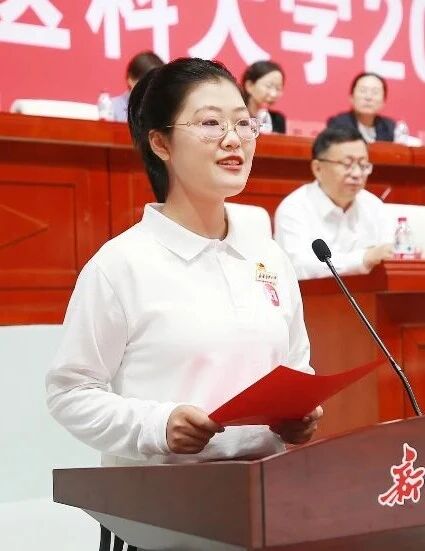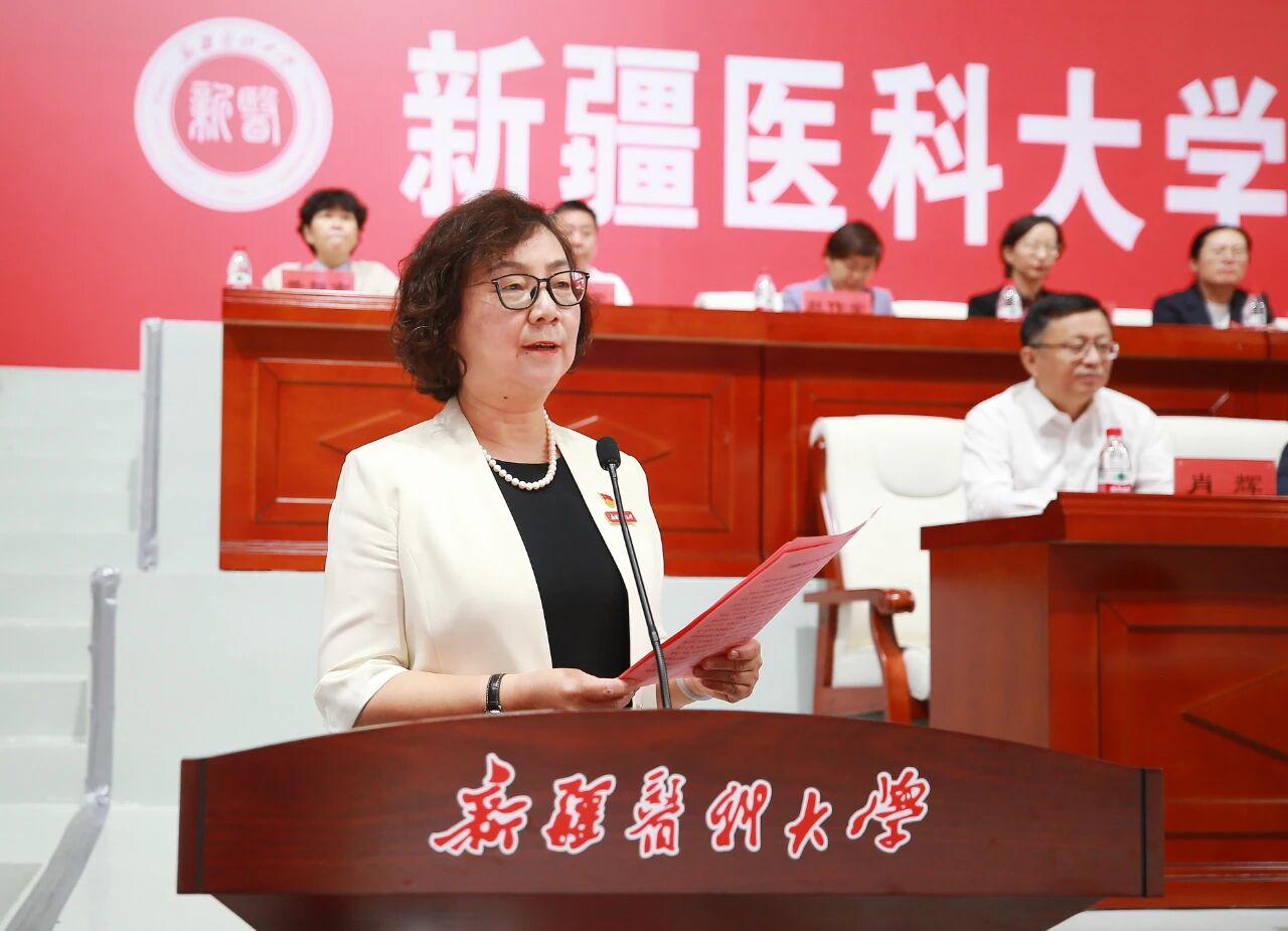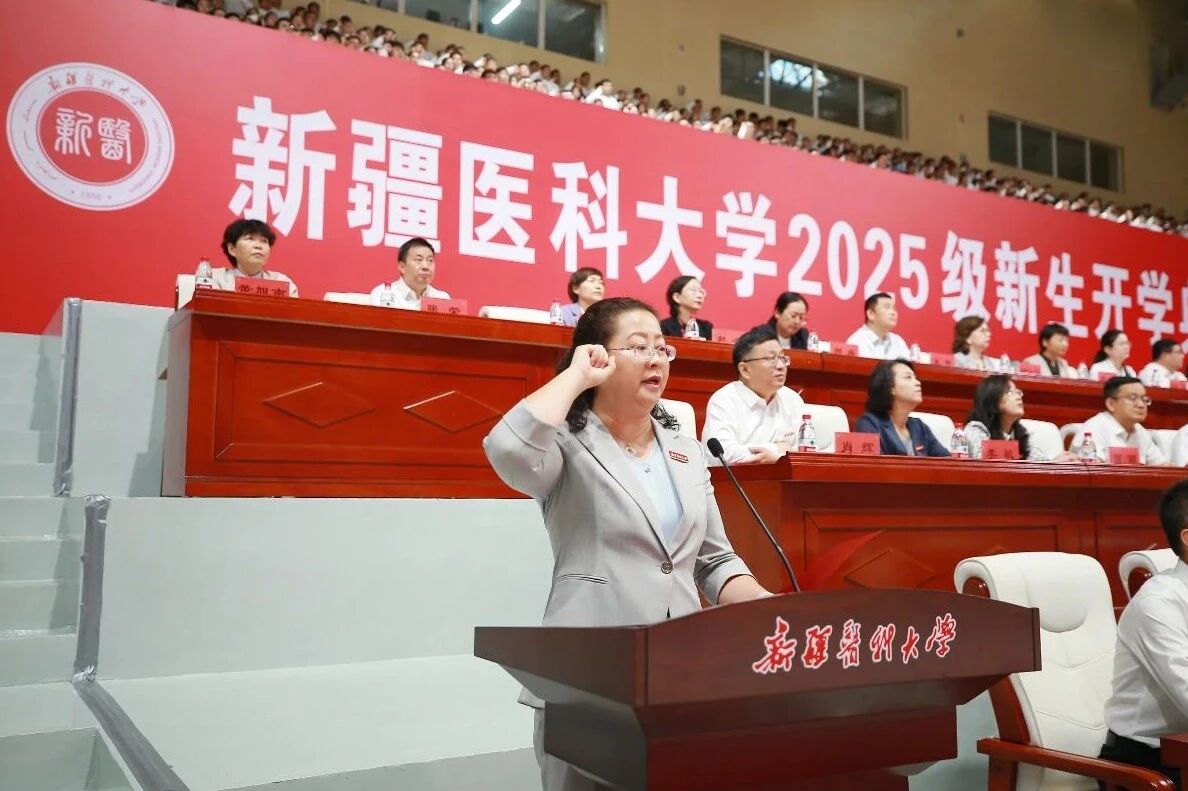 教师代表、国务院政府特殊津贴专家,药学院教授高晓黎在发言中深情回顾了自己与beat365中文官方网站共同成长的岁月,表达了对医药事业的热爱、对新疆土地的深情和一名共产党员科技报国的使命。她特别分享了其团队“孕马结合雌激素的新药研发与产业化”科研项目的艰辛与成就,并勉励全体新生要“做有温度的医者,先做有态度的学生。”希望同学们守护好学医的热情与初心,始终保持对生命的尊重与敬畏,在历练中沉淀、在挑战中坚守,在新医的广阔沃土上,立鸿鹄之志、练过硬本领,拓宽能力视野,实现人生梦想,成长为医术精湛、心怀仁爱的新医人。