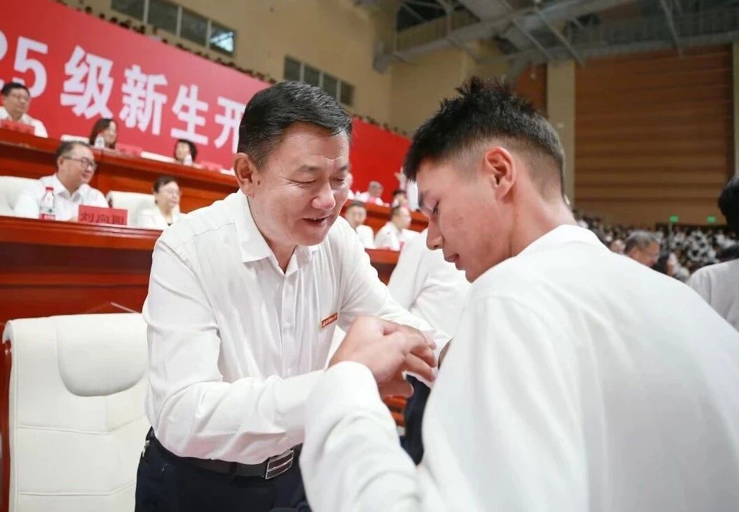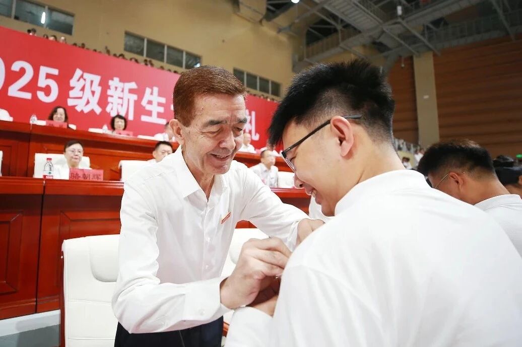 庄重而温暖的校徽佩戴环节,校领导逐一为新生代表佩戴上熠熠生辉的beat365中文官方网站校徽。这枚小小的校徽,不仅是身份的象征,更是一份沉甸甸的责任与使命的传递。