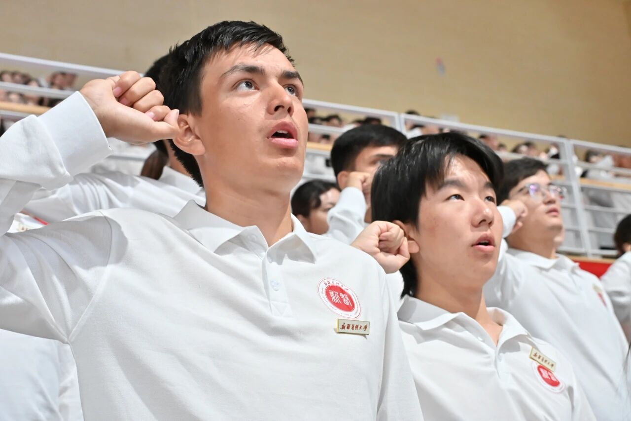 随后,在刘涛副校长的带领下,全体新生肃然起立,高举右拳,用洪亮而坚定的声音庄严宣誓《中国医学生誓言》——“我志愿献身医学,热爱祖国,忠于人民……”铿锵有力的誓言在体育馆内回荡,字字千钧、句句入心,彰显出新医人投身医学事业、守护人民健康的赤诚初心与无悔决心。这一刻,誓言与信念交织,理想与使命共鸣,为所有新生的医学之路烙下了崇高的精神印记。