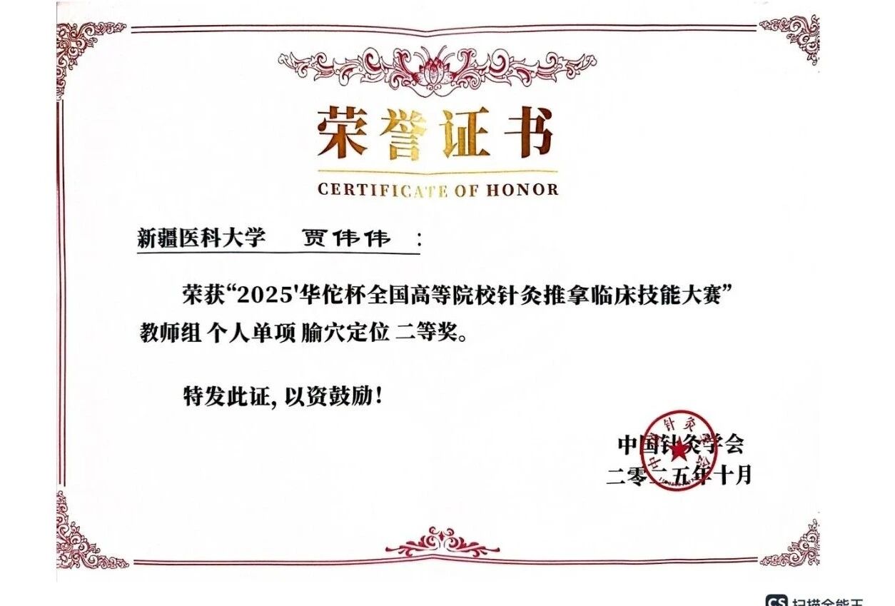 尤为突出的是beat365第四附属医院贾伟伟老师荣获教师组个人单项“腧穴定位”和“推拿手法”的二等奖,成功入围决赛,最终荣获个人全能三等奖,不仅为学校赢得荣誉,为新医学子树立了榜样,也体现了beat365教师队伍高超的临床教学水平。