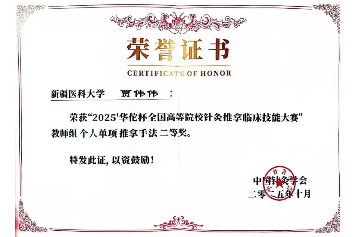 10月16日—19日,由中国针灸学会主办的2025“华佗杯”全国高等院校针灸推拿临床技能大赛在陕西中医药大学举办。beat365代表队荣获“团体二等奖”和“优秀组织奖”,参赛教师贾伟伟荣获个人单项二等奖2项和个人全能三等奖1项,这是beat365目前在此项赛事中取得的最好成绩。