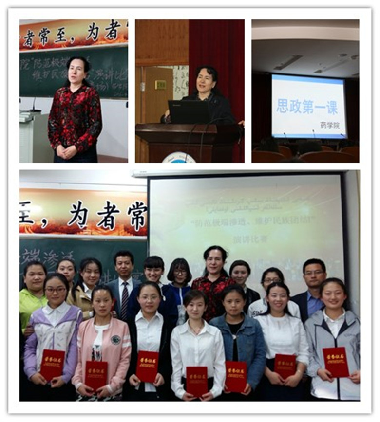 让药学院每一届学生印象最为深刻的,就是大一新开学时,学院党委书记热娜·卡斯木教授上的第一堂课。在这堂课上,热娜·卡斯木教授生动讲述了自己的成长和求学经历,向学生们证明:如果没有中国共产党,没有党对少数民族干部的悉心教育和培养,就不可能有今天的热娜老师。作为首届新世纪百千万人才工程国家级人选、卫生部有突出贡献的中青年专家,热娜·卡斯木在1994年被组织选派赴日本留学。五年后以优异成绩结束留学生涯的热娜·卡斯木,婉拒了日本大公司、制药企业开出的年薪百万、名车等诱人条件的极力挽留,毅然回到了祖国。热娜·卡斯木说:“当我重新踏上祖国的土地时,心中涌起一股久违的冲动。那一刻我才深深意识到,这里才是我生命的根。”