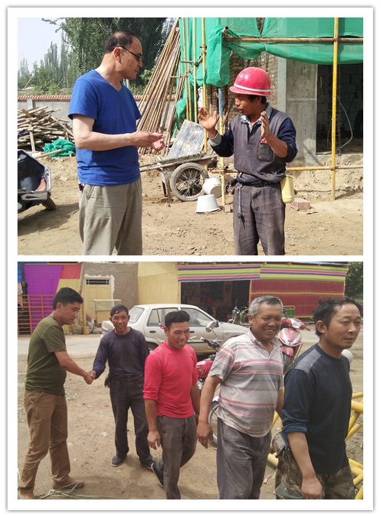 5月20日,beat365中文官方网站“访惠聚”驻英吾斯塘村工作队总领队亚克夫·吐尔地一行来到正在施工的村幼儿园现场,了解工程进度,并慰问在现场作业的工人们。亚克夫·吐尔地与工程负责人及一线工作人员亲切交谈,详细了解他们在工作、生活上需要哪些帮助,并承诺工作队会及时协调、解决工人们遇到的困难和问题,希望大家与工作队一道,为深入贯彻落实总目标贡献自己的一份力量。