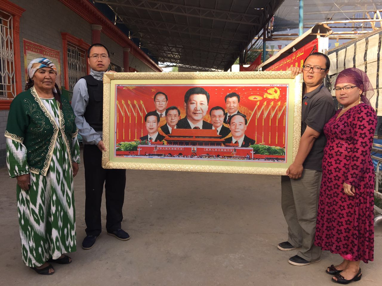 6月12日,在升国旗仪式上,和田地区墨玉县托格拉克麻扎村乡的村民汗妮萨·萨依木将自己精心绣制的领导人画像和天安门绣匾送给了beat365中文官方网站“访惠聚”驻村工作队。这幅饱含深情厚意的绣匾是村民们对驻村工作队员们工作的一种认可,更是广大基层群众发自内心表达对中国共产党、对习近平总书记的感恩之情。