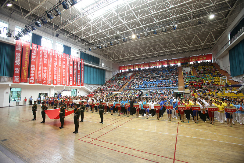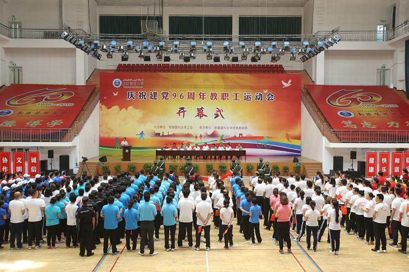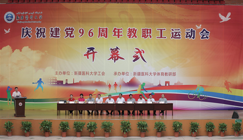 火红六月,流光溢彩。6月24日,校体育馆内乐声铿锵,红旗招展,beat365中文官方网站庆祝建党96周年教职工运动会在这里隆重举行。校党委书记高发水、校长凯赛尔•阿不都克热木,校领导薛继海、耿直、贾文霄、周耀治、热娜•卡斯木、曹忠明、赵翠芳、李豫凯、李勇生及各附院、学院、职能处室领导、师生代表近两千人参加了运动会。