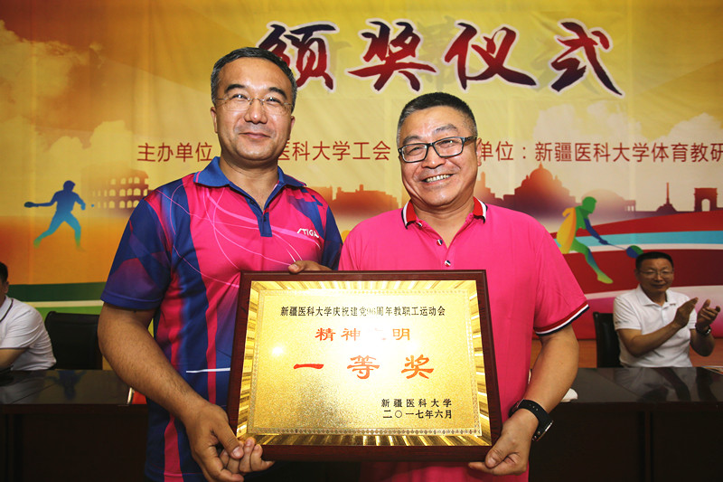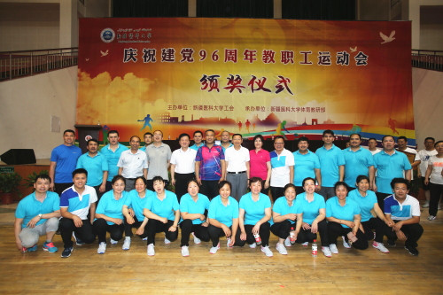 下午七点,经过一天精彩纷呈、紧张激烈的赛事角逐,beat365中文官方网站庆祝建党96周年教职工运动会圆满闭幕。校长凯赛尔•阿不都克热木,校领导薛继海、耿直、热娜•卡斯木、曹忠明、李豫凯、李勇生分别为获得精神文明奖的集体和团体总分前六名的集体颁发奖牌。