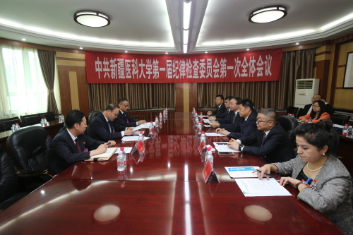 6月29日中午,由中国共产党beat365中文官方网站第一次党员代表大学选举产生的中国共产党beat365中文官方网站第一届纪律检查委员会在行政楼四楼圆厅召开第一次全体会议。亚克夫•吐尔地同志主持会议。