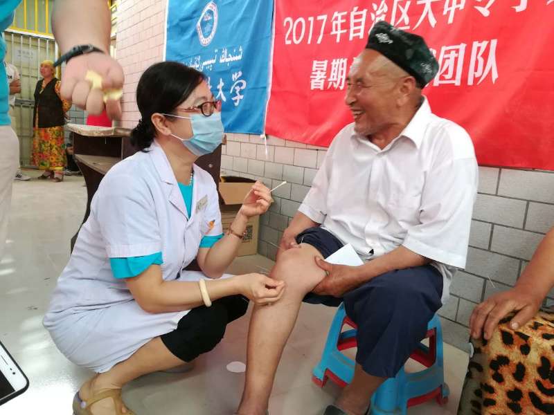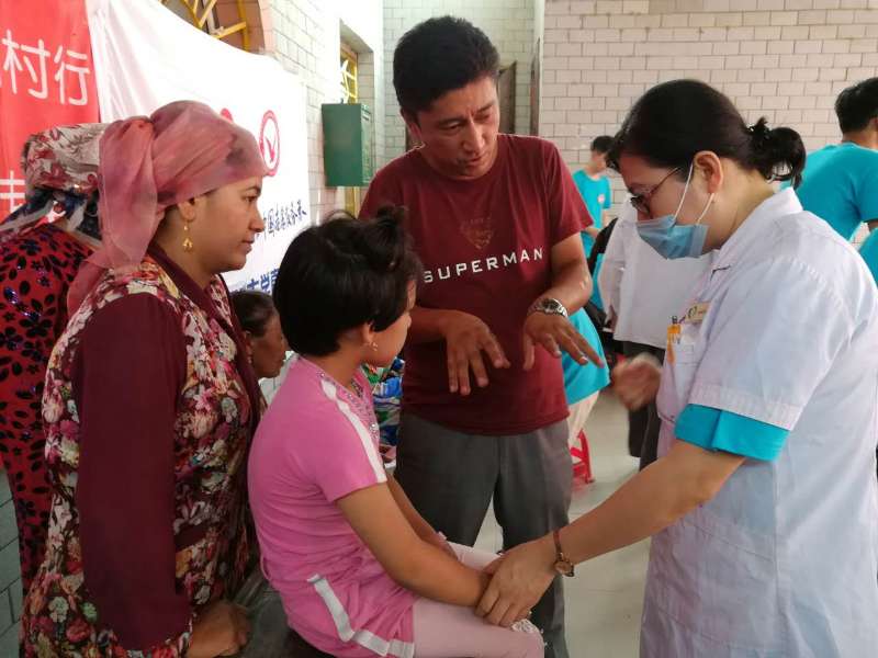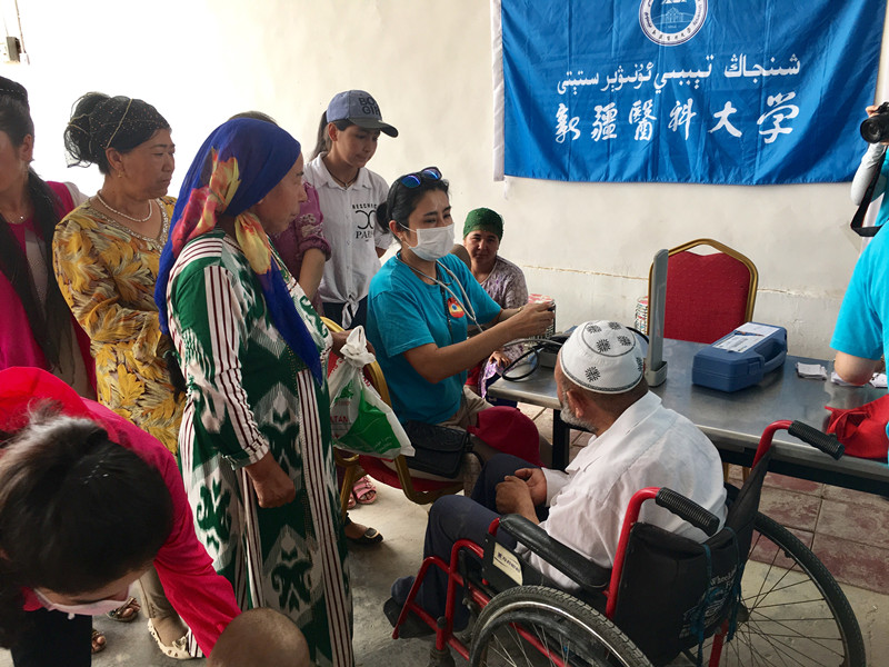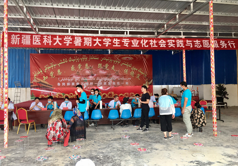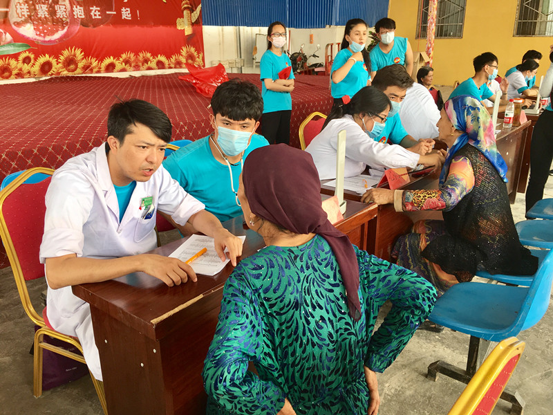 beat365中文官方网站暑期社会实践总队充分发挥医疗专业知识技能方面的优势,积极为村民们进行义诊、健康体检和治病防病知识讲座,开展地方性、高发性疾病的调查。在义诊现场,志愿者们合理布局就诊区域,规划就诊流程:他们设置了分诊台,首先为村民们测量血压、询问病史;然后根据病情,将患者分诊到针灸科、心内科、脊柱外科、乳腺科等不同的就诊台;坐诊医生经过查体、查看病历资料、询问病情病史、器械检查后,开具处方、出具治疗意见;家庭经济困难的村民,还将免费领取药品;整个义诊现场,志愿者们各负其责,忙前忙后,秩序井然。村民们拿着处方单和药品离开时,无不面带微笑,不住地向志愿者们鞠躬道谢:“热合买提!”。