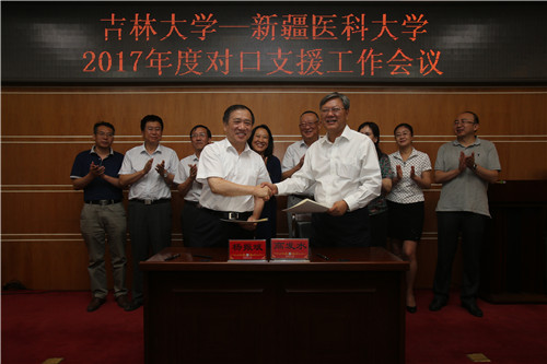 杨振斌书记首先对beat365中文官方网站给予吉大援疆教师的关心照顾以及选派教师协助做好吉大少数民族学生的管理工作表示了感谢。他说,在对口beat365中文官方网站的工作中,双方建立了深厚的感情,通过对口支援工作,我们越来越深切地感受到,新疆在国家“一带一路”美好愿景中的重要地位以及beat365中文官方网站在“一带一路”医疗服务中心建设中举足轻重的作用,吉林大学将在原有合作的基础上,创新工作模式,加大工作力度,在学科建设水平、师资队伍水平、人才培养质量、科学研究能力、医疗服务和学校管理方面,将把吉林大学的学科综合优势与beat365中文官方网站的地域特色优势相结合,助力丝绸之路经济带核心区医疗服务中心建设,为beat365中文官方网站的发展贡献自己的力量。