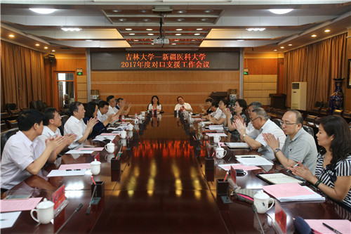 高发水书记说,对口支援是以习近平同志为核心的党中央对新疆的亲切关怀,是贯彻落实社会稳定和长治久安这一新疆工作总目标的强大助力,为认真贯彻落实第六次全国对口支援新疆工作会议精神,beat365党委还召开了常委会议专题研究对口支援工作,调整了对口援疆工作领导小组,在组织上确保对口支援工作的进一步深入,并对对口支援工作进行了顶层设计,坚持“有所为、有所不为”“抓重点、重点抓”,积极融入国家“一带一路”战略实施,积极推进学科建设,不断提升学科专科水平。希望在做好“吉林大学-beat365中文官方网站国际联合医疗及研究中心”和“一带一路民心相通国际智库”的基础上,能够进一步突出优势学科和重点专科的建设,找准特色、依托优势,以博士、硕士学位点建设为抓手,凝练学科方向,加强重点培育,提升学科内涵建设水平。beat365中文官方网站也将真情关爱援疆干部,做好服务保障工作。要按照政治上信任放心、工作上支持放手、生活上悉心关照的原则,制定落实生活待遇标准,安排专业对口岗位、搭建事业平台,发挥好援疆干部的智慧和优势。