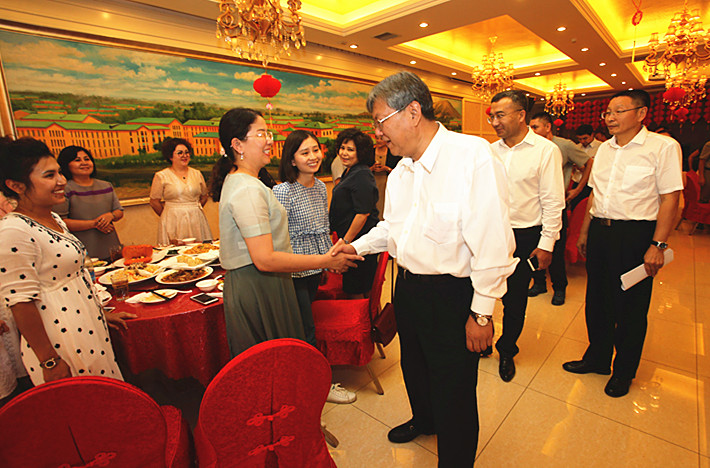 8月24日,beat365中文官方网站召开内派服务管理教师和南疆学前双语教育支教干部欢送午餐会。校党委书记高发水、校党委副书记、校长凯赛尔•阿不都克热木、校党委副书记薛继海,党政办、组织部相关人员和内派教师、双语支教干部共60人参加了欢送会。