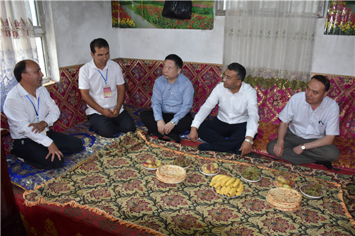 落座之后,凯校长与阿卜杜海比尔一家人亲切交谈,唠起家常,认真听取了他们的生活诉求和未来打算,了解了beat365中文官方网站驻村工作队开展“访惠聚”工作的情况。阿卜杜海比尔的母亲激动地告诉凯校长:“现在党的惠民政策越来越多,家里的条件也越来越好,你们的工作队来了之后,为村里做了很多实事好事。我的孙子、孙女都在崭新漂亮的幼儿园里上学,你们派来的老师照顾他们就像自己的孩子一样,村里的新小学也破土动工了,整个村子都在发生翻天覆地的变化。我一定让我的儿子努力工作,我们一家人都会听党话、感党恩、跟党走”。凯校长表示beat365中文官方网站“访惠聚”工作队永远是村民们的工作队,我们会一如既往的扎扎实实开展“访惠聚”驻村各项工作,用心用力用情的为村民办好事办实事,让每一位村民深深感受到党的关怀。