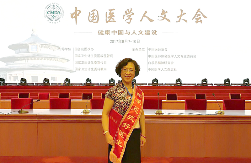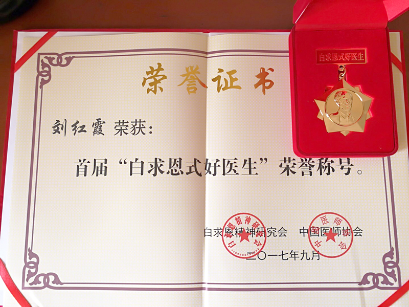 2017年9月8日,由国务院医改办、国家卫生计生委指导,中国医师协会、中国医师协会人文专业委员会、白求恩精神研究会、中国医学人文杂志社主办的“中国医学人文大会”在北京召开。开幕式上,举行了首届“白求恩式好医生”推荐结果发布及颁奖仪式,beat365中文官方网站附属中医医院皮肤科主任刘红霞教授获得首届“白求恩式好医生”荣誉称号,全国共50位医师获此项殊荣,该奖项两年评选一次,全国284名医师获“白求恩式好医生”提名奖。