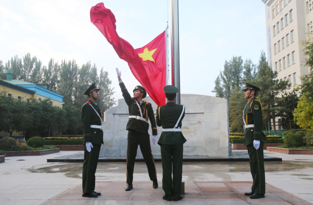 蓝天印衬着五星红旗格外耀眼,高发水书记发表国旗下的讲话。他说,68年来,在中国共产党的坚强领导下,中国人民艰苦奋斗、百折不挠,用几十年的时间完成了其他国家几百年走过的发展历程,一改积贫积弱、一穷二白的落后面貌,从站起来、富起来到强起来,取得了举世瞩目的辉煌成就。特别是在党中央的亲切关怀和全国人民的大力支援下,新疆进入经济社会发展最快、人民群众得实惠最多的历史时期,天山南北发生了翻天覆地的变化,新疆各族人民形成前所未有的合力,汇聚起了实现社会稳定和长治久安的磅礴力量。