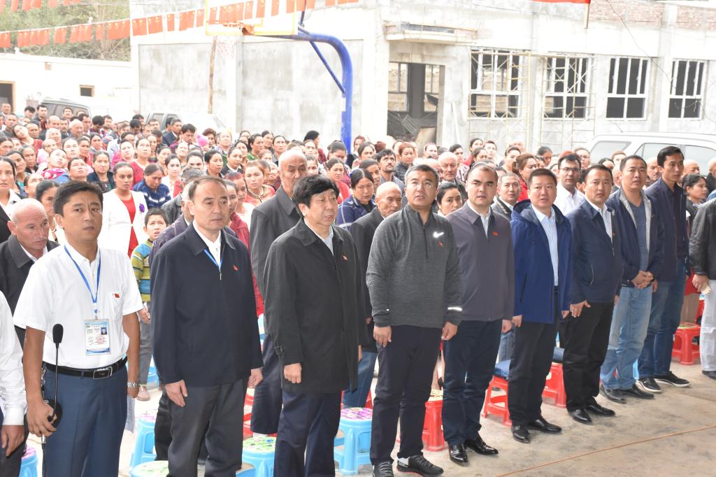 上午10点,升国旗仪式准时开始,伴随着雄壮的国歌声,全场人员共唱国歌,鲜艳的五星红旗伴随着初升的朝阳冉冉升起。升国旗仪式后,在beat365中文官方网站党委副书记、纪委书记、驻墨玉县前方(临时)党工委书记、驻村工作队总领队亚克夫·吐尔地的带领下在国旗下郑重宣誓:永远热爱党、热爱祖国、热爱中华民族大家庭,坚决遵守宪法和法律,坚决同“三股势力”作斗争,坚决抵制宗教极端,坚决不做“两面人”“两面派”,坚决不上敌人的当,擦亮眼睛、敢于斗争,用鲜血和生命反对分裂,捍卫祖国统一!