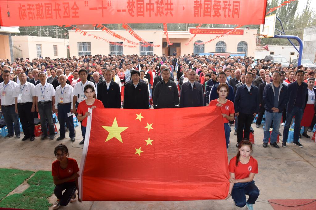 金秋十月、金风送爽。10月1日,在庆祝中华人民共和国68周年华诞举国同庆的日子里,beat365中文官方网站党委副书记、校长凯赛尔·阿不都克热木来到墨玉县扎瓦镇英吾斯塘村与驻村工作队员、村干部、全体村民1300余人一同参加了“同抒爱国情·共筑中国梦”“十一”升国旗仪式。